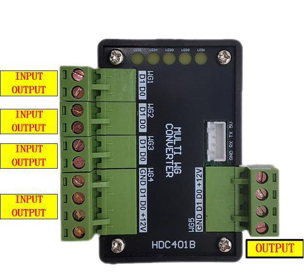 产品说明4路韦根通讯转换器可同时连接4个门禁RFID读卡器或人脸识别机及指纹机。不同设备的韦根信号被集中起来,并输出到门禁主板上的同一个韦根接口,能够解决多个门禁设备共享的问题。该转换器采用高速、大容量的微控制单元(MCU),可轻松处理4路信号的接收与传输。