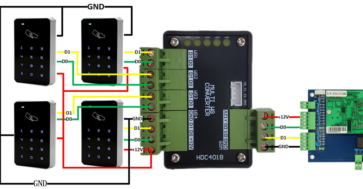 接线时,每个设备至少应连接D0、D1、GND这3根线,以确保转换器与读卡器或门禁控制器连接到同一接地端。